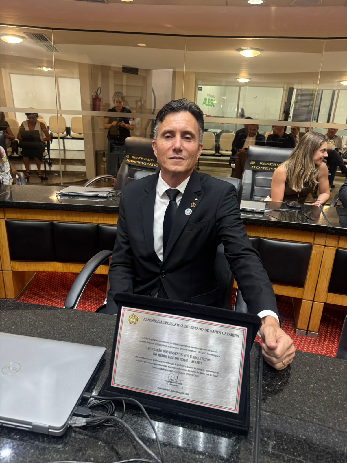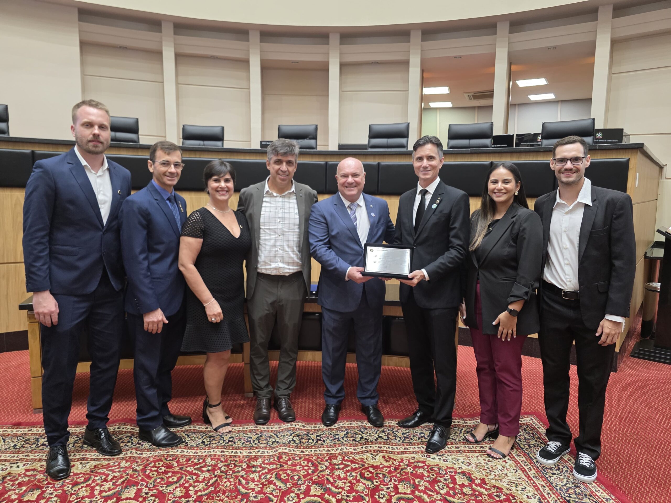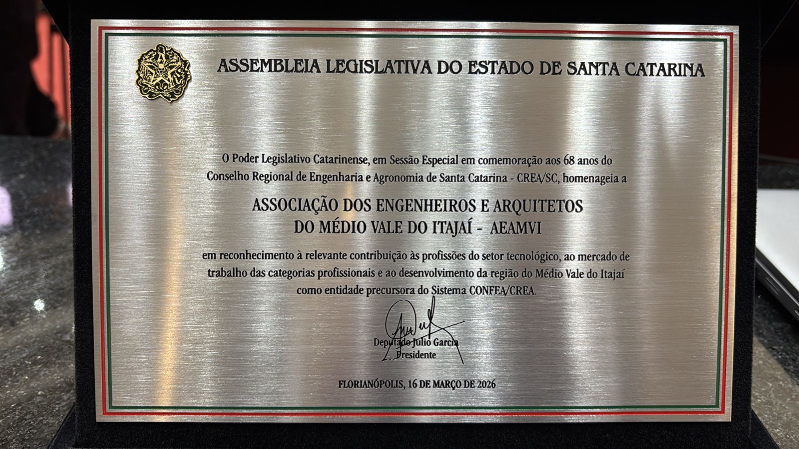 Em Sessão Solene da Assembleia Legislativa de Santa Catarina, para celebrar os 68 anos do CREA-SC, a AEAMVI foi homenageada como entidade precursora. O ato solene, realizado na noite de segunda-feira, dia 16, foi proposto pela mesa diretora, reconhecendo a trajetória do Conselho, de entidades e lideranças que contribuem para o fortalecimento do sistema Confea/Crea/Mútua e o desenvolvimento do estado.