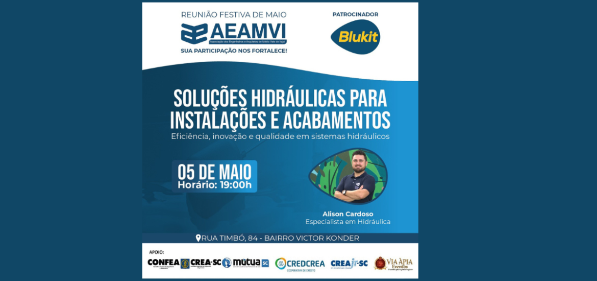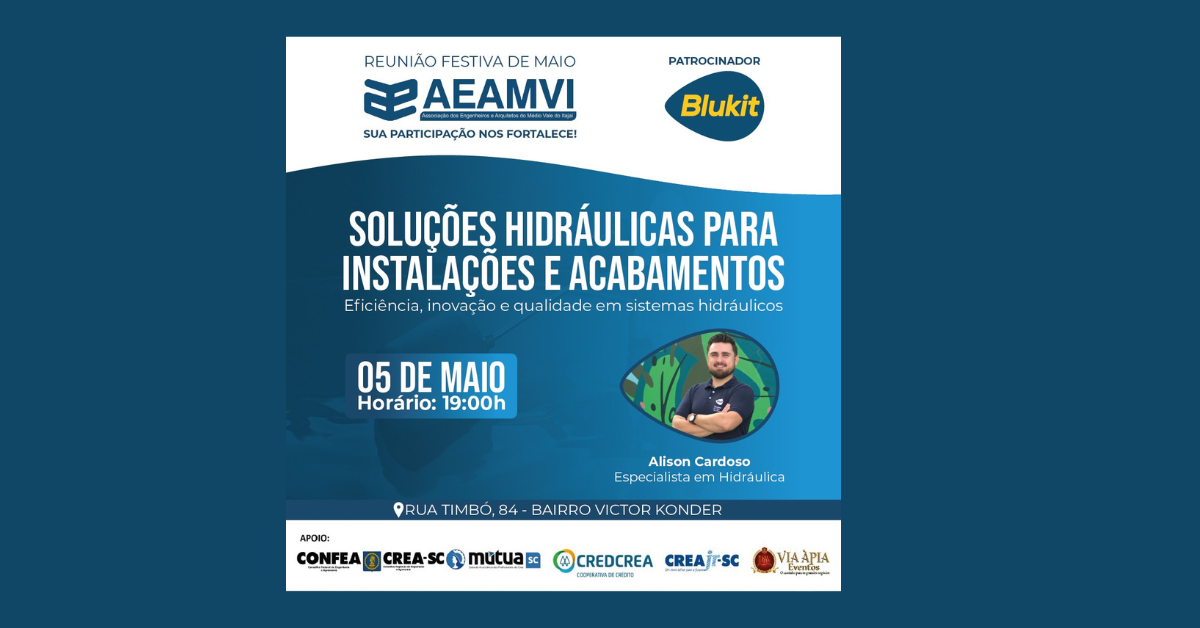 No próximo dia 05 de maio, a AEAMVI realiza sua terceira Festiva de 2026. O encontro técnico e de networking terá o patrocínio da empresa Blukit, quando o profissional Alison Cardoso ministrará a palestra: “Soluções Hidráulicas para Instalações e Acabamentos”. A festiva inicia às 19 horas, no auditório da Inspetoria de Blumenau do CREA-SC