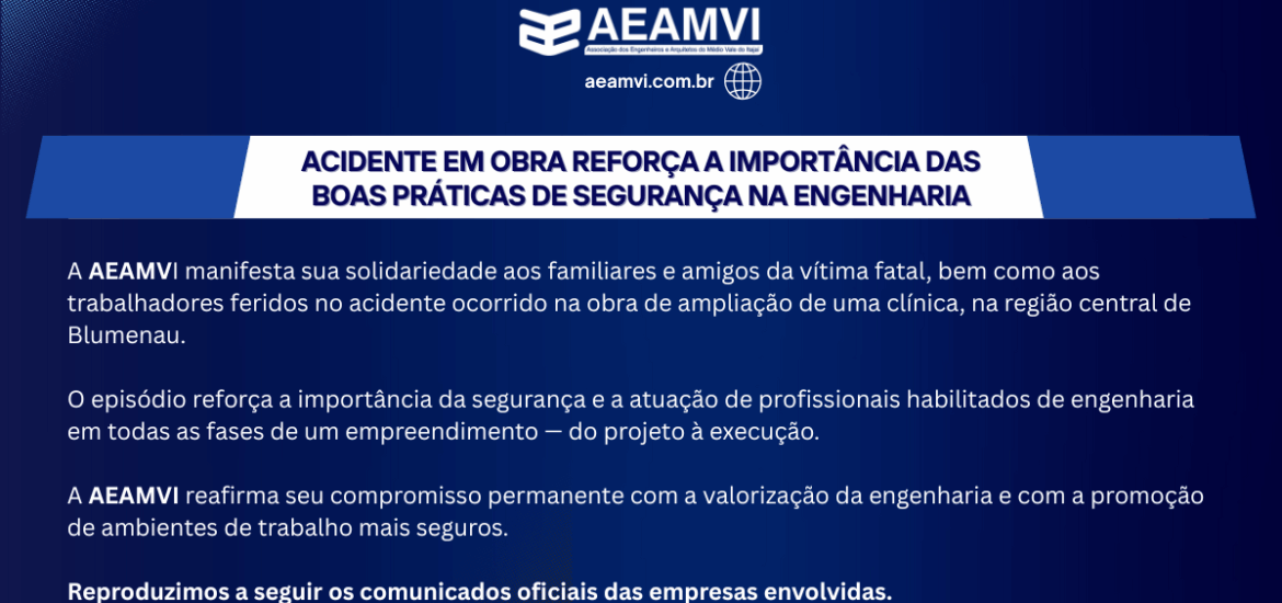 Ressalta, ainda, que todos os procedimentos de segurança foram seguidos à risca em todas as etapas da obra e que o colapso não ocorreu na obra principal, mas em uma estrutura que era utilizada na montagem de uma laje lateral. A companhia atuou junto com o Corpo de Bombeiros e demais entidades para garantir atendimento o mais rápido possível.