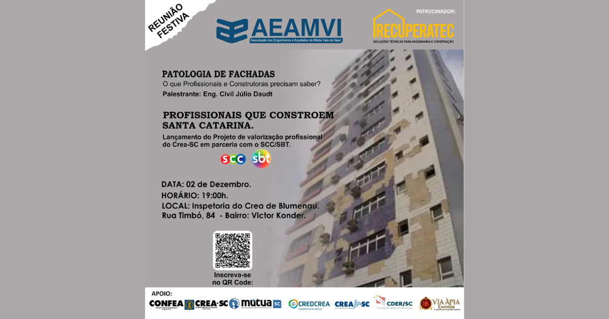 O evento conta com o patrocínio da Recuperatec e trará uma ótima palestra sobre patologia de fachadas e o que profissionais e construtoras precisam saber. O engenheiro civil Júlio Daudt será o palestrante. O profissional é professor, Mestre e D.Sc. Candidate. Atua como diretor da Associação Brasileira de Patologia das Construções (ALCONPAT-Brasil) e integra o Instituto Brasileiro do Concreto (IBRACON).